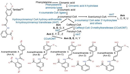 Proposed biosynthetic pathway of major avenanthramides in oat (Avena sativa L.) [,,].