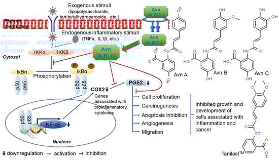 A predicted mechanism of avenanthramides (Avns)-mediated anti-inflammatory in skeletal muscle C2C12 cells. Avns, the polyphenolic molecules identified solely in oats, exhibit anti-inflammatory activity mainly by inducing nuclear factor-kappaB (NF-κB) inactivation in C2C12 cells. Avns downregulated the expression of IκB kinase beta (IKKβ) as an inhibitor of NF-κB kinase subunit beta in cellular response to tert-butyl hydroperoxide (tBHP)-meditated oxidative stress and attenuated the expression tumor necrosis factor alpha (TNFα) and interleukin 1β (IL-1β) at the transcriptional level under the same condition. Furthermore, Avns reduced the expression of cyclooxygenase-2 (COX-2) protein, along with decreased prostaglandin E2 (PGE2) levels. The downregulated COX2/PGE2 pathway leads to the inhibition of cell proliferation, migration, apoptosis suppression, angiogenesis, and carcinogenesis in various cell lines. Thus, Avns can be potent inhibitors of NF-κB-mediated inflammatory response following the downregulation of IKKβ activity in C2C12 cells [,].