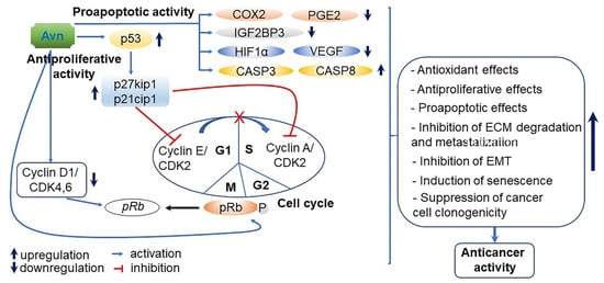A proposed action mode of avenanthramides (Avns)-derived antiproliferative and proapoptotic activity. p53, and p27kip1 and p21cip1 activated by Avns treatment suppress the expression of cyclin E/ cyclin-dependent kinase 2 (CDK2) and cyclin A/CDK2 associated with cell cycle, and lead to the cell cycle arrest (G1 to S phase). In addition, Avns also downregulate the expression of cyclin D1/CDK4,6 and enhances phosphorylation of Rb protein (pRb) as a tumor suppressor. As a result, Avns cause cell cycle arrest of M phase. Based on these results, Avns play a vital role in the positive control of the cell cycle and in tumor progression [,]. With regard to proapoptotic activity, Avns upregulate caspase 3 (CASP3) and caspase (CASP8), while they downregulate insulin-like growth factor 2 mRNA-binding protein 3 (IGF2BP3), hypoxia-inducible factor 1-alpha (HIF1α), vascular endothelial growth factor (VEGF), cyclooxygenase 2 (COX2), and prostaglandin E2 (PGE2) in tumor cell lines []. Therefore, Avns reinforce anticancer effects through increased antioxidative, antiproliferative and proapoptotic effects, as well as induction of senescence, and inhibition of extracellular matrix (ECM) degradation and metastatization and epithelial-mesenchymal transition (EMT).