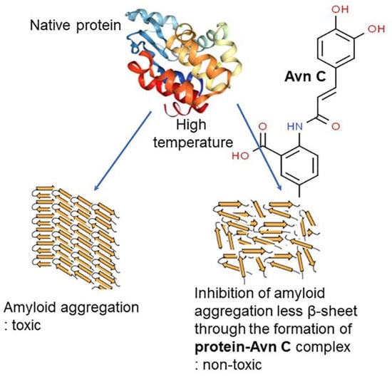 Prevention of amyloid formation in the presence of avenanthramide C (Avn C). The assembly of misfolded protein into amyloid fibrils that have a high β-sheet-rich secondary structure is associated with many human diseases, including central nervous diseases (Parkinson’s, Alzheimer’s, and Huntington’s disease), amyotrophic lateral sclerosis, and type 2 diabetes, and diseases related to the accumulation of insoluble serum amyloid A protein in liver, spleen, and kidney. Although great efforts have been made to elucidate the pathogenesis of these diseases and development of effective therapy to date, there is still no evidence for the treatment and prevention associated with amyloid-related diseases. Polyphenols such as avenanthramides have been widely studied as a key factor of amyloid aggregation inhibitors. Their bioactive effects depend on the number and position of hydroxyl groups around the flavone backbone. Avn C can act as a potential biomolecule in inhibiting protein aggregation by decreasing the formation of β-sheet structure of protein aggregates [].