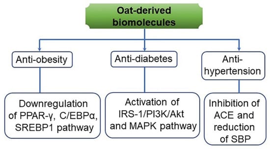 A predicted action mode of anti-obesity, anti-diabetes, and anti-hypertension effects from oat-derived biomolecules and by-products. Anti-obesity is associated with the downregulation of peroxisome proliferator-activated receptor gamma (PPAR-γ), CCAAT-enhancer-binding protein isoform alpha (C/EBPα), and sterol regulatory element-binding protein 1 (SREBP1). Anti-diabetes is involved in the activation of insulin receptor substrate 1 (IRS-1)/phosphoinositide 3-kinase (PI3K)/protein kinase B (Akt) and AMP-activated protein kinase (AMPK) signaling pathway. Anti-hypertension is related to the inhibition of angiotensin-converting enzyme (ACE) and the reduction of systolic blood pressure (SBP) [].
