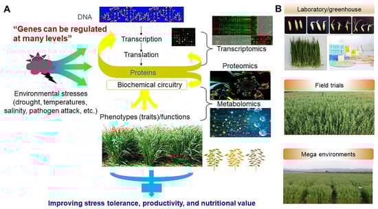 Breeding strategy of oat crop plants to improve stress tolerance, productivity, and high nutritional value based on transcriptomics, proteomics, and metabolomics (A), and evaluation of agronomic traits on laboratory and greenhouse conditions, field trials, and mega environments (B).