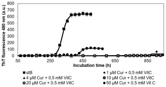 Thus, the results of the kinetics measured by ThT fluorescence (Figure 1) indicated that fibrillation was absent at 1 µM Cur + 0.5 mM VitC, 4 µM Cur + 0.5 mM VitC, 10 µM Cur + 0.5 mM VitC, and 20 µM Cur + 0.5 mM VitC. Only at 50 µM Cur + 0.5 mM VitC did the fibrillation reaction occur as judged by ThT fluorescence, but after a prolonged lag phase of 400 h, which was 140 h longer than that for stB alone. However, the final ThT fluorescence at the plateau phase remained low (Figure 1). This prolongation of the lag phase was significantly longer than the increase of 100 h when 50 µM Cur alone was present in the fibrillation mixture together with stB, as shown before [27].