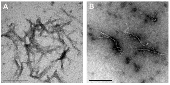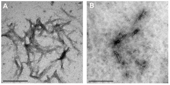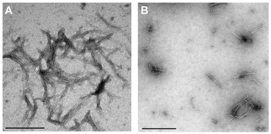 TEM images of stB fibrils at the plateau phase (A) (adapted from Ref. [27]) alone or (B) at 50 µM Cur + 0.5 mM vitC. Scale bars = 0.5 µm.