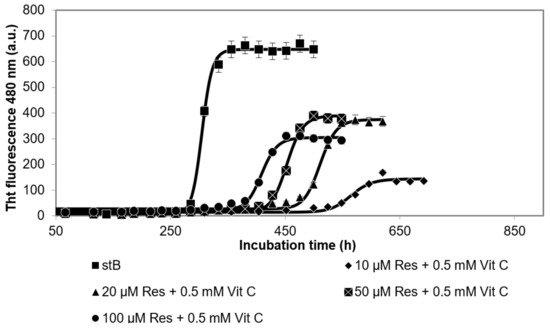 Time course of ThT fluorescence intensity following amyloid fibril formation of stB in the presence of resveratrol (Res). Different concentrations of Res (as indicated) were added, while vitC concentration was kept constant at 0.5 mM.