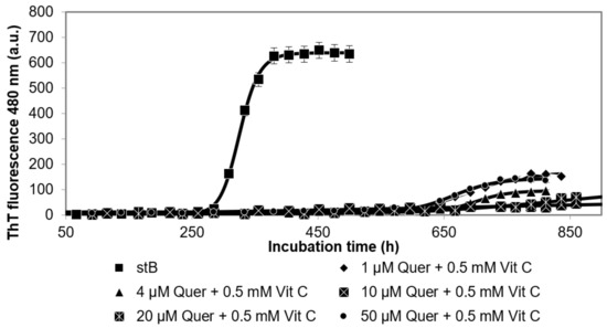 The time course, i.e., the kinetics, of fibrillation by stB as measured by ThT fluorescence (Figure 5) showed that, at all concentrations of Quer and additional 0.5 mM vitC (1 µM Quer + 0.5 mM vitC, 4 µM Quer + 0.5 mM vitC, 10 µM Quer + 0.5 mM vitC, 20 µM Quer + 0.5 mM vitC, and 50 µM Quer + 0.5 mM vitC), the lag phase was prolonged for about 450 h in comparison to stB without antioxidants. Furthermore, the intensity of ThT fluorescence at the plateau phase was drastically lowered. This effect was much stronger than the effect of 0.5 mM vitC alone.