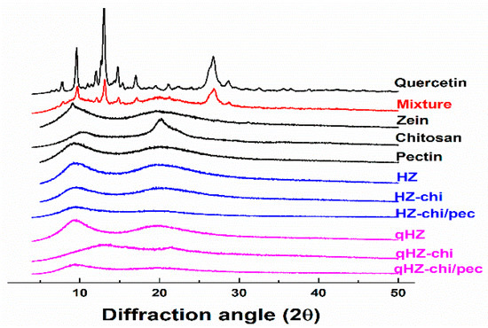 Quercetin is a crystalline solid in its pristine form [38], as evident from sharp X-ray diffraction patterns at 8, 10, 12, 13.01, 15, 17 and 27 of diffraction angle (2θ) (Figure 3). The distinct peaks of quercetin with lower intensities were apparent in its mixture of zein, chitosan and pectin. In the diffractograms of qHZ, qHZ-chi and qHZ-chi/pec particles, the crystalline peaks of quercetin disappeared, advocating the transformation from crystalline to an amorous state upon encapsulation in particles [10,39]. Pure zein and chitosan showed mild crystallinity with moderate peaks at 9.56 and 20.24 2θ because of respective α-helixes and crystal lattice structure [40,41]. When zein was structured into HZ, HZ-chi, HZ-chi/pec, qHZ, qHZ-chi and qHZ-chi/pec particles, the diffraction pattern raised from α-helixes in zein and crystal lattice of chitosan became flattened due to interaction between the polymers during the formation of the composite particles [42,43].