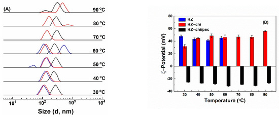Effect of temperature on size distribution qHZ (blue), qHZ−chi (red) and qHZ−chi/pec (black) (A) and ζ−potential (B) of quercetin−loaded composite hollow zein particles.