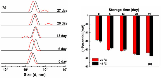 Size distribution (A) and ζ−potential (B) of quercetin−loaded hollow zein particles coated with chitosan and pectin at 25 °C (red) and 45 °C (black) during storage.
