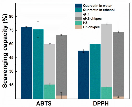 The antioxidant activity of encapsulated quercetin was investigated by ABTS and DPPH radical scavenging assays (Figure 9). The ABTS+ scavenging capacity of quercetin-loaded HZ was lower than the quercetin dispersed in water and ethanol. The reason for the lower scavenging capacity of encapsulated quercetin is being embedded in the hydrophobic pockets of protein and inaccessible to ABTS+ [30]. Furthermore, the hydroxyl groups in the B ring of quercetin are the main contributor of H+ and are involved in hydrogen bonding in the composite particles, thus unavailable to scavenge the free radicals. Earlier, quercetin encapsulated in SPI and solid zein particles showed a similar reduction in the ABTS+ savaging capacity. On the other hand, the interfacial chitosan-pectin coating in quercetin-loaded HZ-chi/pec particles may increase the accessibility of hydrophilic ABTS+ to quercetin, demonstrating higher scavenging of ABTS+ compared with that of qHZ (Figure 9). DPPH scavenging capacity of quercetin was improved upon encapsulation in HZ and HZ-chi/pec particles by compared with that of dispersed in ethanol and water (Figure 9). Earlier, it has been reported that both zein and DPPH being soluble in ethanol–water binary medium facilitate scavenging of DPPH by hydrophobic antioxidants encapsulated in the zein particles [62,63]. The ABTS and DPPH radical scavenging assay revealed that by encapsulating quercetin in composite hollow zein particles, it could be better protected from free reactive radicals in the surrounding medium along with an improved or sustained antioxidant activity.