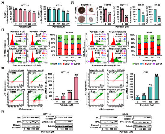 Anticancer effects of polydatin on colon cancer cells. (A) The proliferation analyses were conducted to determine the antiproliferative effects of polydatin (0, 50, 100, 200, and 300 µM). The relative proliferative degree of HCT116 and HT-29 cells gradually decreased with increased polydatin concentration. (B) The formation of spheroids was observed by Leica’s DM3000 microscope. Bright field images show the changes in spheroids morphology after treatment with 300-µM polydatin. The relative total area and density of spheroids were quantified using ImageJ. Scale bar: 100 µm. (C) The cell distribution in cell cycle was analyzed using PI staining. (D) The reduction of MMP was identified by JC-1 assay. Red represents JC-1 monomers and the green, JC-1 aggregates. The bar graphs show that the reduction of MMP was elevated with polydatin dose increasing (0, 100, 200 and 300 µM) in HCT116 and HT-29 cells. (E) Western blot of apoptosis-related proteins after both colon cancer cells were added with various doses of polydatin (0, 50, 100, 200, and 300 µM). The asterisks indicate significance of statistics between control and polydatin-treated groups (* p < 0.05, ** p < 0.01, and *** p < 0.001).