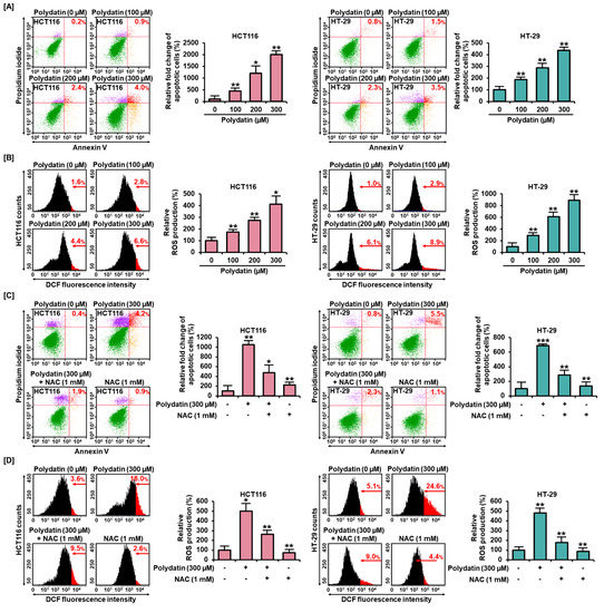 ROS production and apoptosis in response to polydatin in HCT116 and HT-29. (A) Apoptotic HCT116 and HT-29 treated with polydatin were evaluated using Annexin V and PI dyes. The red in the dot plot indicates late apoptotic cells. (B) ROS generation was determined using dichlorofluorescin (DCF) fluorescent dye by flow cytometry. (C) With or without ROS scavenger, the apoptotic cells induced by polydatin were stained using Annexin V and PI dyes. (D) The effects of polydatin ROS generation with or without NAC in HCT116 and HT-29 cells were analyzed by flow cytometry. The asterisks indicate statistical significance of the effect of treatment (* p < 0.05, ** p < 0.01, and *** p < 0.001).