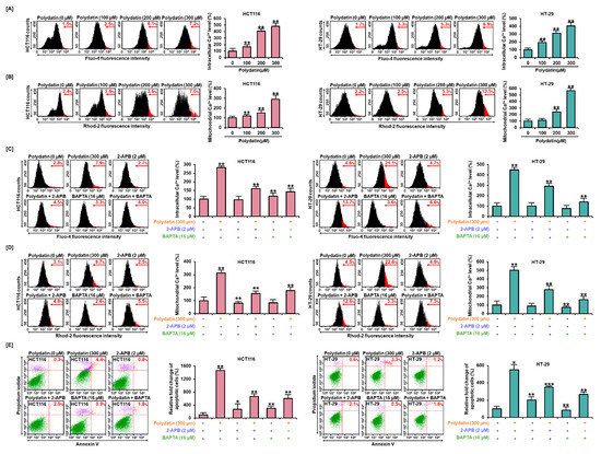 Polydatin caused the disturbance of calcium regulation and apoptosis in HCT116 and HT-29 cells. (A) In response to polydatin, the cytosol calcium concentrations in colon cancer cells were evaluated by flow cytometry analysis with Fluo-4 dye. (B) The colon cancer cells treated with polydatin were stained with Rhod-2 dye to analyze mitochondrial calcium concentrations. (C,D) Effects of polydatin with specific calcium-channel inhibitors, 2-APB (IP3R), BAPTA/AM (intracellular calcium), (C) cytosol, and (D) mitochondrial calcium levels in HCT116 and HT-29 cells. (E) Effects of polydatin with each calcium-channel inhibitor on apoptosis in HCT116 and HT-29 cells by Annexin V and PI staining. The asterisks indicate statistical significance of the effect of treatment (* p < 0.05, ** p < 0.01, and *** p < 0.001).