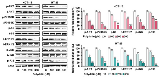 Dose-dependent inhibitory effects of polydatin on MAPK and PI3K/AKT signaling pathway in HCT116 and HT-29 cells. Each protein’s phosphorylation level was quantified with each total protein. The asterisks signify statistical variation among polydatin-treated and vehicle-treated groups (* p < 0.05, ** p < 0.01, and *** p < 0.001).