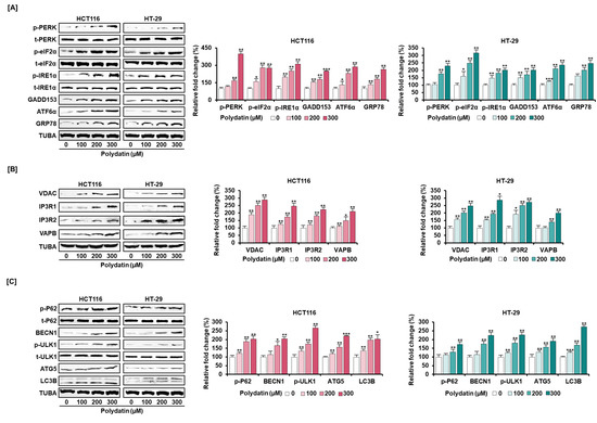 Dose-dependent stimulatory effects of polydatin on protein levels related to anticancer ability. (A) The protein expression of ER stress inducers—PKR-like ER-resident kinase (p-PERK), inositol-requiring enzyme 1α (IRE1α), and activating transcription factor 6α (ATF6α), ER stress sensor—eukaryotic translation-initiation factor 2α (p-eIF2α), and growth arrest and DNA damage-inducible gene 153 (GADD153), and the upregulation protein of ER stress sensor—glucose-regulated protein 78 (GRP78), when HCT116 and HT-29 cells were treated with diverse concentrations of polydatin. (B) Effects of polydatin on ER-mitochondria-tethering proteins (VDAC, IP3R1, IP3R2, and VAPB) in HCT116 and HT-29 cells by Western blotting. (C) The protein levels of phosphorylated P62 (p-P62), beclin-1 (BECN1), phosphorylated UNC-51-like kinase 1 (p-ULK1), autophagy-related 5 (ATG5), and microtubule-associated proteins 1A/1B light chain 3B (LC3B) implicated in autophagy. The expression of each protein was normalized compared with TUBA or each total protein. The asterisks mean statistical variation between polydatin-treated and DMSO-treated groups (* p < 0.05, ** p < 0.01, and *** p < 0.001).
