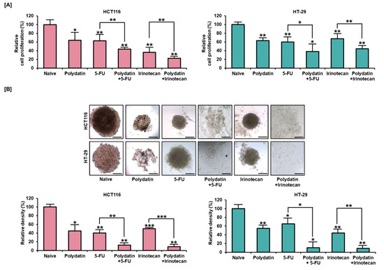 The antiproliferative effect of polydatin was evaluated in combination with the widely used anticancer drugs known as irinotecan or 5-FU. As shown in Figure 6A, polydatin, used in combination them, significantly attenuated the proliferation of colon cancer cells. Moreover, we confirmed that the polydatin treatment added with 5-FU or irinotecan could further hinder spheroid formation in 3D culture. In HCT116 cells, polydatin reduced the total spheroid density from 40% to 12% (p < 0.01) when combined with 5-FU, and from 50% to 9% (p < 0.001) when combined with irinotecan. In HT-29 cells, polydatin also decreased the relative spheroid density when combined with 5-FU or irinotecan from 65% to 10% (p < 0.05) and from 44% to 9% (p < 0.01), respectively, as indicated in Figure 6B. Our results suggest that a synergetic effect is produced by the combination of polydatin with standard anticancer drugs in colon cancer.