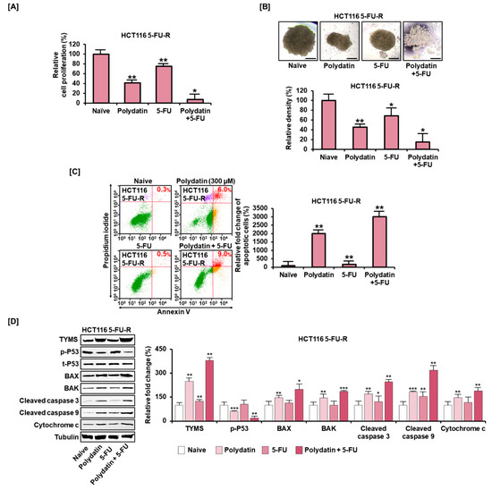 To determine the impact of polydatin in overcoming 5-FU resistance in colon cancer cells, 5-FU resistant cells were established by adding 5-FU to HCT116 and by increasing its concentration gradually for a long period; then, these cells were named 5-FU-resistant (5-FU-R). They exhibited elevated resistance to the antiproliferative effect of 5-FU. However, polydatin reduced the proliferation of 5-FU-R cells more effectively than the addition of 5-FU alone did, and the effectiveness was reinforced from 75% to 7% when polydatin was combined with 5-FU (Figure 7A). Similarly, the relative spheroid density in 5-FU-R cells was significantly reduced from 69% to 15% when polydatin was combined with 5-FU, compared to the treatment using 5-FU alone (Figure 7B). Moreover, polydatin markedly increased apoptosis in 5-FU-R cells by 2000% (Figure 7C). Subsequently, we assessed whether these effects on 5-FU-R cells were correlated with the activity of thymidylate synthase (TYMS), a target 5-FU protein, and apoptosis-related factors (BAX, P53, BAK, cleaved caspase 3, cleaved caspase 9, and cytochrome c) by Western blot analysis. Overall, 5-FU alone did not significantly alter the expression of these proteins in 5-FU-R cells. However, when polydatin was combined with 5-FU, these protein levels were upregulated, except for the phosphorylation of P53 (Figure 7D). These results imply that polydatin may have a potential to alleviate induced 5-FU resistance in colon cancer.
