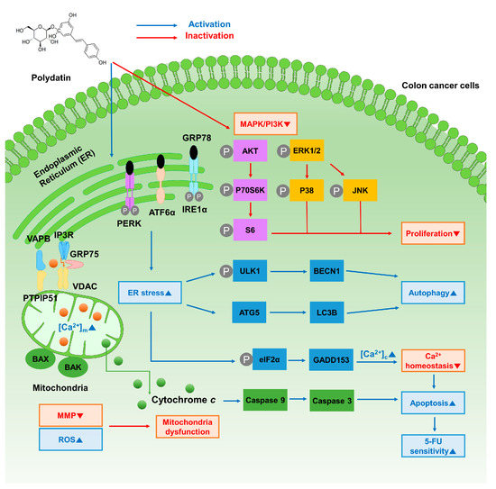 Another intracellular event causing the disruption of calcium homeostasis is ER stress, which also leads to cellular dysfunction and apoptosis once it enters irreversible stages [32,33]. Various intracellular physiological alterations occur in ER stress conditions. Firstly, under prolonged conditions of perturbation of ER functions caused by the accumulation of unfolded proteins, various processes can be induced, such as the unfolded protein response (UPR) and well-organized intracellular reactions, to restore protein folding homeostasis. The UPR is mainly associated with three ER-localized proteins—PERK, IRE1α, and ATF6—which are retained in their inactive states by interacting with GRP78 [34]. mRNA translation is inhibited to protect ER from an overflow of newly synthesized proteins. PERK and its downstream proteins, including eIF2α and GADD153—known as C/EBP homologous protein (CHOP)—are responsible for the overall process of this translational inhibition [33,35]. A previous study has already proven that polydatin enhances apoptosis of human cancer cells through the increase of ER stress, which is identified by the increase in CHOP [19]. Secondly, the increasing expression level of the BAX and BAK proteins could also be associated with the process of ER calcium-mediated apoptosis. The temporary overexpression of these proteins stimulates the release of ER calcium, resulting in an increase in mitochondrial calcium, and eventually, these signals induce the release of cytochrome c [36]. For example, increased ER stress, confirmed by the higher expression levels of GRP78 and phosphorylated eIF2α (p-eIF2α), leads to apoptosis in human adenoid cystic carcinoma cell lines [37]. Herein, we observed the escalation of phosphorylated PERK (p-PERK) and eIF2α, as well as the activation of IRE1α, ATF6, GRP78, and GADD153 after polydatin treatment. Additionally, the increases in BAX, BAK, and cytochrome c were detected by Western blotting analysis. Therefore, ER stress induced by polydatin leads to cell death through the release of pro-apoptotic factors. Third, during ER stress response, the activation of autophagy is triggered by several molecules associated with ER stress signals [38]. Autophagy is comparable to ER stress in that it works as a double-edged sword and produces either a protective or apoptosis-promoting reaction [39]. Recently, the strategies targeting autophagy have started to be regarded as prospective methods for cancer therapy, as they suppress or promote autophagy-associated proteins. In head and neck carcinoma, the activation of autophagy through upregulation of LC3B and BECN1 produces a tumor suppressive effect [40,41]. Many experts in diverse fields of medicine have reported that polydatin has protective effects against injury of the heart, liver, and other organs, through the regulation of autophagosome formation. For example, polydatin has a powerful effect on post-treatment in C57BL/6 mice which have undergone heart injury through stimulation of autophagy. In the cell line model of non-alcoholic steatohepatitis (NASH), polydatin mitigates lipid accumulation and restores lysosomal activity via autophagic flux. Moreover, polydatin ameliorates blood vessel lesions in atherosclerotic mice by rehabilitating autophagy [42,43,44]. Our immunoblotting results suggest that polydatin stimulates autophagy-related proteins, including phosphorylated ULK1, BECN1, ATG5, and LC3B, and has a protective effect against colon cancer. Although the explicit molecular mechanisms of how polydatin affects the formation of autophagosomes are not entirely understood, our results reveal that polydatin regulates autophagy induced by ER stress in colon cancer cells. Overall, polydatin promotes the perturbation of calcium homeostasis induced by ER stress response.