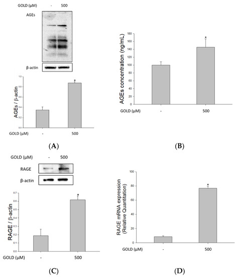 AGE accumulation in the body can cause several serious disorders. Currently, RAGE is considered a key factor that transmits AGE signals. Various lesions are known to be exacerbated through several signaling processes via RAGE. Therefore, we determined the formation of AGEs and RAGE expression in the presence of GOLD. Besides, we investigated the association between AGE formation and RAGE distribution in mesangial cells. As shown in Figure 1A,B, when GOLD was added, AGEs were detected not only intracellularly but also extracellularly. We confirmed that the protein and mRNA levels of RAGE increased with AGE production (Figure 1C,D). In addition, immunofluorescence analysis revealed that GOLD induced the expression of RAGE and its translocation to the cell membrane in SV40 MES 13 cells (Figure 1E). Collectively, these findings demonstrate that GOLD induces AGE levels and RAGE expression compared with untreated cells.