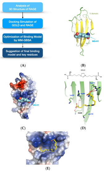 The GOLD-binding site in RAGE is the same as that of the methylglyoxal-lysine dimer (GOLD), as demonstrated in a previous article [25]. The binding model between GOLD and RAGE was predicted by docking simulation, and the final model was suggested using Molecular Mechanics energies combined with the Generalized Born and Surface Area (MM-GBSA) calculation. All calculations were performed using Glide and Prime modules of MAESTRO (Schrödinger LLC, New York, NY, USA) in a Linux environment with default parameters [26].
