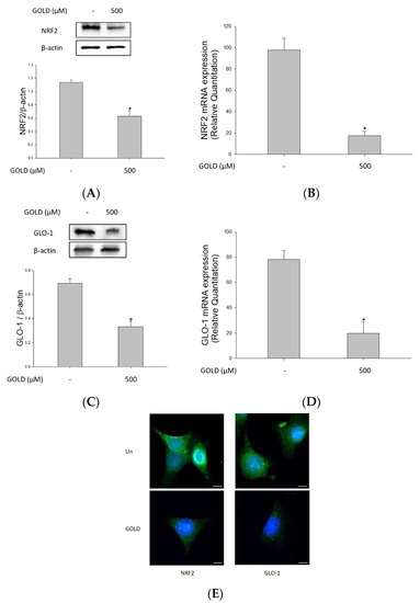Effects of GOLD on nuclear factor erythroid 2-related factor 2 (NRF2) and the glyoxalase 1 (GLO1) signaling pathway. SV40 MES 13 cells were incubated in the presence or absence of GOLD (500 μM) for 24 h. (A,C) Protein levels of NRF2 and GLO1 were measured using Western blotting. (B,D) mRNA levels of NRF2 and GLO1 were determined using RT-qPCR. (E) Cells were incubated with anti-NRF2 and -GLO1 primary antibodies, followed by FITC-labeled anti-rabbit IgG. Cells were observed under fluorescence microscopy at ×400 magnification. β-actin levels were used as the internal control. Scale bars, 20 μm. Data are expressed as the mean ± SEM of three independent experiments. * p < 0.05 indicates a significant difference compared to the untreated group.