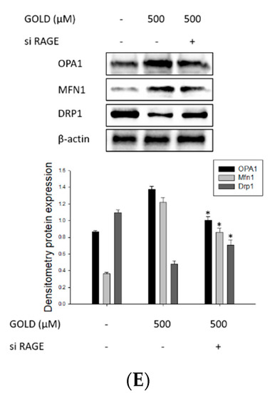 SV40 MES 13 cells were seeded into 60 mm cell culture plates at a density of 2 × 106 cells/well and incubated with GOLD (500 μM). After treatment, cultured cells were rinsed with PBS and suspended in a homogenized lysis buffer. The supernatant was collected after centrifugation for 5 min at 12,000× g and 4 °C. The protein concentration was determined using a DC protein assay kit (Bio-Rad, Hercules, CA, USA), with BSA as the standard. Whole-cell lysates were separated using 6–15% SDS-PAGE and transferred to a nitrocellulose membrane (Bio-Rad Laboratories, Hercules, CA, USA). Membranes were blocked with 5% skim milk in Tris-buffered saline containing 0.2% Tween 20 at 20–22 °C for 1 h and probed with the appropriate primary (1:500) and secondary (1:5000) antibodies. Blots were developed using an enhanced chemiluminescence kit. In each experiment, the density ratio represents the relative intensity of each band normalized to that of β-actin as a control. The following antibodies were used: Phospho-ERK (#9101), ERK (#9102), phospho-JNK (#9258), JNK (#9251), phospho-p38 (#4551), p38 (#8690), and NRF2 (#12721), all from Cell Signaling Technologies (Danvers, MA, USA); TNF-α (sc12744), IL-6 (sc32296), IL-1β (sc12742), OPA1 (sc393296), Mfn1 (sc16664), and Drp1 (sc271583), all from Santa Cruz Biotechnology, (Dallas, TX, USA), RAGE (ab216329); IL-18 (ab74495), p21 (ab188224), p27 (ab32034), CDK2 (ab32147), and GLO-1 (ab171121), all from abcam (Cambridge, UK); and AGEs (bs1158R), all from BIOSS (Woburn, MA, USA).