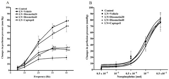 Effect of diosmetin and captopril on the contractile response to EFS (A) and exogenous NE (B) in the mesenteric vascular bed. a p < 0.05 vs. control group, b p < 0.05 vs. LN + vehicle group, c p < 0.05 vs. LN + diosmetin20 group. LN, L-NAME; LN + diosmetin20, L-NAME treated with 20 mg/kg of diosmetin; LN + diosmetin40, L-NAME treated with 40 mg/kg of diosmetin; LN + captopril, L-NAME treated with captopril (n = 8/group). Statistical analysis between the five groups was performed using the one-way ANOVA followed by Turkey’s post hoc test.