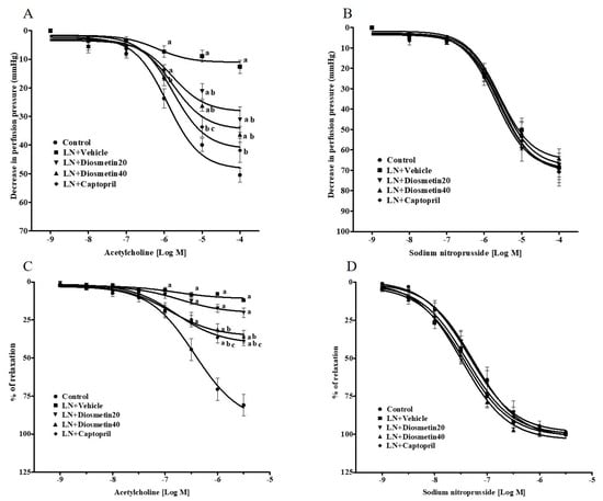 Effect of diosmetin and captopril on the vascular response to exogenous acetylcholine (A) and sodium nitroprusside (B) in the mesenteric vascular bed and exogenous acetylcholine (C) and sodium nitroprusside (D) aortic rings. a p < 0.05 vs. control group, b p < 0.05 vs. LN + vehicle group, c p < 0.05 vs. LN + diosmetin20 group. LN, L-NAME; LN + diosmetin20, L-NAME treated with 20 mg/kg of diosmetin; LN + diosmetin40, L-NAME treated with 40 mg/kg of diosmetin; LN + captopril, L-NAME treated with captopril (n = 8/group). Statistical analysis between the five groups was performed using the one-way ANOVA followed by Turkey’s post hoc test.
