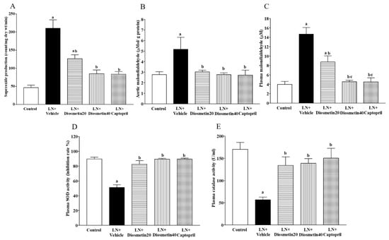 There were significant increases in vascular O2•− production and vascular and plasma MDA levels in the LN group compared to the control group (Figure 4A–C) (p < 0.05). These alterations were improved by the diosmetin and captopril treatments (p < 0.05). The plasma SOD and CAT activities were decreased in the LN group, while supplementation with diosmetin and captopril restored these activities (p < 0.05) in the hypertensive rats, as shown in Figure 4D,E, respectively.