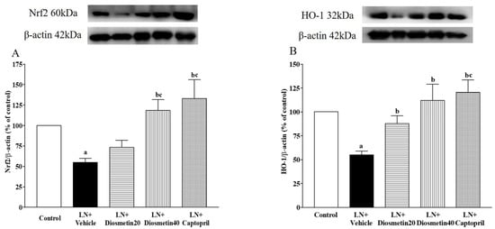 As shown in Figure 6A,B, the LN group had a downregulation of Nrf2 and HO-1 protein expression compared to the control group (p < 0.05). Diosmetin and captopril administration significantly improved the expression of Nrf2 and HO-1 protein altered by L-NAME (p < 0.05).