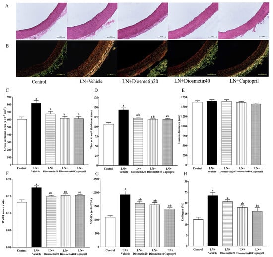 As depicted in Figure 7A–H, the LN group showed significant increases in the cross-sectional area, vascular wall thickness, wall/lumen ratios, and vascular smooth muscle cell numbers compared to the control group (p < 0.05). Treatment with diosmetin and captopril considerably decreased the alteration of vascular morphology altered by L-NAME (p < 0.05). However, the luminal diameters did not differ between groups, as shown in Figure 7E. Interestingly, an increase in the vascular collagen content in hypertensive rats was also alleviated by diosmetin and captopril supplementation (p < 0.05) (Figure 7H).