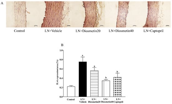 Immunohistochemical staining showed the enhancement of IL-6 expression in the LN group compared to the control group (p < 0.05). Treatment with diosmetin and captopril alleviated the expression of IL-6 (p < 0.05), as shown in Figure 8A,B.