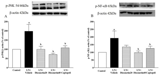 Effect of diosmetin and captopril on the p-JNK/p-NF-κB protein expression in vascular tissue (A,B) in LN-induced hypertensive rats. a p < 0.05 vs. control group, b p < 0.05 vs. LN + vehicle group. LN, L-NAME; LN + diosmetin20, L-NAME treated with 20 mg/kg of diosmetin; LN + diosmetin40, L-NAME treated with 40 mg/kg of diosmetin; LN + captopril, L-NAME treated with captopril (n = 4/group). Statistical analysis between the five groups was performed using the one-way ANOVA followed by Turkey’s post hoc test.