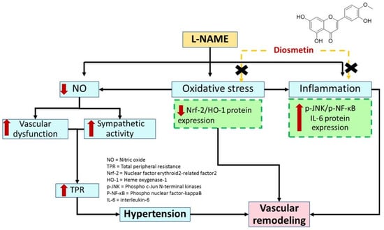 This study demonstrated that diosmetin has antihypertensive effects on L-NAME- induced high blood pressure in rats. Diosmetin also alleviates endothelial dysfunction and overactivation of sympathetic nerve-mediated vasoconstriction in conduit and small arteries in hypertensive rats. Aortic hypertrophy and fibrosis (increased collagen contents) were observed in L-NAME-treated rats, and these were mitigated by diosmetin treatment. These effects were accompanied reductions in systemic and tissue oxidative stress markers (MDA and O2•−) as well as enhancements in antioxidant enzymes (SOD and CAT), which were associated with restoration of the Nrf2/HO-1 protein expression in vascular tissue. Diosmetin also suppressed the enhancement of IL-6 staining in aortic tissue and downregulated the p-JNK/p-NF-κB protein expression in L-NAME rats. Meanwhile, captopril alleviated L-NAME-induced blood pressure elevation as well as vascular dysfunction and remodeling. It also reduced oxidative stress and inflammation and restored the Nrf2/HO-1 and p-JNK/p-NF-κB protein expressions in L-NAME-treated rats.