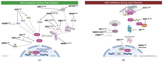 Graphical abstract of effect observed in the literature on NRF2 during viral infections. (a) Graphical overview of the activation of NRF2 during viral infection. (b) Graphical overview of the inhibition of NRF2 during viral infection.