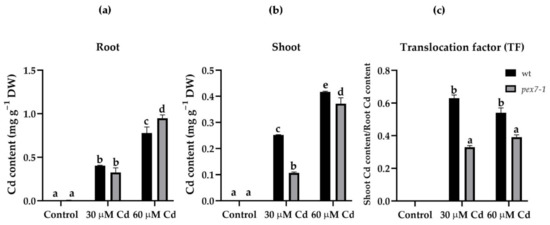 Mean values (±SE) from three technical replicates of cadmium (Cd) accumulation (mg g−1 DW) through ICP-OES in roots (a) and shoots (b) of wt and pex7-1 seedlings not exposed (Control) or exposed to 30 µM CdSO4 (30 µM Cd) or 60 µM CdSO4 (60 µM Cd) and of the translocation factor (c) of wt and pex7-1. Columns labelled with different letters show statistical differences for at least p < 0.05 among treatments within the same genotype and between genotypes within the same treatment. Columns labelled with the same letter are not statistically different (p > 0.05). Data are from the first biological replicate.