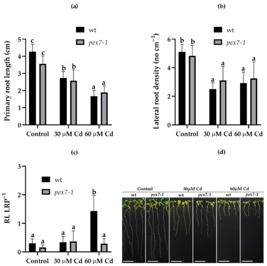 Mean values (±SE) (from three biological replicates) of the primary root length (a), lateral root density (b), of the ratio between the number of mature lateral roots (LR) and the lateral root primordia (LRP) (c) and macroscopic images (d) of wt and pex7-1 seedlings not exposed (Control) or exposed to 30 µM CdSO4 (30 µM Cd) or 60 µM CdSO4 (60 µM Cd). Columns labelled with different letters show statistical differences for at least p < 0.05 among treatments within the same genotype and between genotypes within the same treatment. Columns labelled with the same letter or with no letter are not statistically different (p > 0.05). n = 30. Bars = 1 cm.