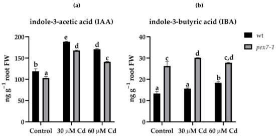 Mean values (±SE) from three technical replicates of IAA (a) and IBA (b) content (ng g−1 FW) in roots of wt and pex7-1 seedlings not exposed (Control) or exposed to 30 µM CdSO4 (30 µM Cd) or 60 µM CdSO4 (60 µM Cd). Columns labelled with different letters show statistical differences for at least p < 0.05 among treatments within the same genotype and between genotypes within the same treatment. Columns labelled with the same letter are not statistically different (p > 0.05). Data from the first biological replicate.