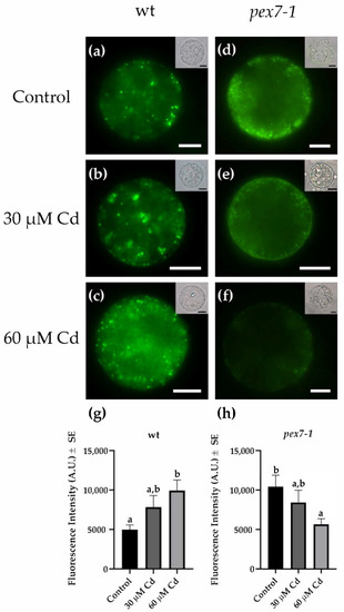 To deepen the role of peroxisomes in the responses to Cd toxicity, the variations of the peroxisomal signal after the heavy metal exposure were analyzed in pex7-1 root protoplasts in comparison with the wt (Figure 4) by the use of the N-BODIPY probe [69]. In Cd absence, a higher (Figure 4a,d,g,h) and more diffuse (Figure 4a,d) peroxisomal signal was observed in pex7-1 protoplasts in comparison with the wt. Cadmium treatments induced an increase in the peroxisomal signal in the protoplasts extracted from wt roots (Figure 4b,c), which at the higher Cd concentration became significantly higher than the Control treatment (Figure 4g). Interestingly, the protoplasts extracted from the roots of the mutant showed a progressive decrease in the peroxisomal signal in the presence of Cd (Figure 4e,f) in comparison with the Control (Figure 4d). Indeed, the peroxisomal signal was strongly reduced at the higher Cd concentration in comparison with the Control (Figure 4f,h). These results demonstrate that the peroxisomes of pex7-1, already altered by the mutation, are more damaged by the presence of the heavy metal than those of the wt.