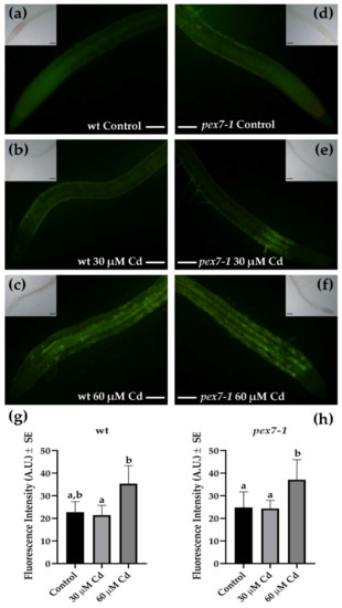 APF epifluorescence analysis showing peroxynitrite (ONOO−) signal in the wt (a–c) and pex7-1 (d–f) roots from seedlings grown in the absence ((a,d) Control) or in the presence of 30 µM CdSO4 (30 µM Cd) (b,e) or 60 µM CdSO4 (60 µM Cd) (c,f). Insets in (a–f) show the same field under white light. (g,h) Mean values (±SE) from three biological replicates of APF fluorescence intensity measured using ImageJ software (version 1.53c, Wayne Rasband, National Institutes of Health, Bethesda, USA) and expressed in arbitrary units (A.U.s; from 0 to 255). Columns labelled with different letters among treatments show statistical differences for at least p < 0.05 level. Columns labelled with the same letter are not statistically different (p > 0.05). Bars = 100 µm. n = 30.