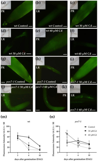 DCFH-DA epifluorescence analysis showing H2O2 signal in the primary (PR) and lateral (LR) roots of wt (a–f) and pex7-1 seedlings (g–l) grown in the absence ((a,b,g,h), Control) or in the presence of 30 µM CdSO4 (30 µM Cd) (c,d,i,j) or 60 µM CdSO4 (60 µM Cd) (e,f,k,l). Insets in (a–l) show the same field under white light. (m,n) Mean values (±SE) from three biological replicates of DCFH-DA fluorescence intensity at different days after germination (DAG) measured in the PR apices and elongation zones using ImageJ software (version 1.53c, Wayne Rasband, National Institutes of Health, Bethesda, USA) and expressed in arbitrary units (A.U.s; from 0 to 255). Asterisks show statistical differences for at least p < 0.05 level with respect to the Control within the same day. Bars = 100 µm (d,f,h,j,k) and insets in (a,d,f,h,j,k), 50 µm (a–c,e,g,i,l) insets in (b,c,e,g,i,l). n = 30.