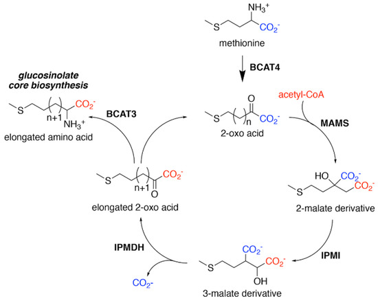 Aliphatic Glucosinolate Chain Elongation. Conversion of methionine to its corresponding 2-oxo acid (4–(methylsulfanyl)–2–oxobutanoate) by branched-chain amino transferase 4 (BCAT4) provides the starting point for the chain elongation cycle. A series of reactions catalyzed by methylthioalkylmalate synthase (MAMS), isopropylmalate isomerase (IPMI), and isopropylmalate dehydrogenase (IPMDH) result in elongation of the aliphatic chain by a single methylene group. The elongated 2–oxo can undergo transamination to the corresponding amino acid by BCAT3 or reenter the chain elongation cycle.
