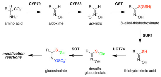 The resulting cytochrome P450 products are conjugated to the sulfur donor glutathione by glutathione-S-transferases to produce S-alkyl-thiohydroximates, which serve as substrates for the carbon-sulfur lyase SUR1 [55]. This is the first enzymatic transformation in the core glucosinolate biosynthesis pathway that links their assembly to enzymes of sulfur metabolism [7,56]. The thiohydroximates generated by SUR1 undergo S-glycosylation catalyzed by glucosyltransferases of the UGT74 family to form desulfoglucosinolates. UGT74C1 glucosylates the methionine-derived molecules and UGT74B1 modified the aromatic amino acid-derived compounds [57,58].