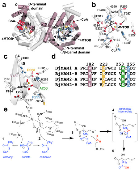 MAMS structure and mechanism. (a) Dimeric structure of B. juncea MAMS. Respective monomers are colored white and rose with secondary structure features labeled in the rose monomer. Positions of CoA and substrate 4–methylthio–2–oxobutanoic acid (4MTOB) are indicated. (b) Active site view showing the location of 4MTOB, divalent metal (M), and CoA. (c) View of the substrate binding site. This view centers of the bound 4MTOB and shows the position of the three β-strands that form the back-wall of the site. The four residues (Val182, Glu223, Ala253, and Pro255) that guide substrate preference are indicated. (d) Targeted sequence alignment of BjMAM1A/B and BjMAM2A/B. The four residues that dictate substrate preference are indicated. (e) Proposed reaction sequence of MAMS-catalyzed condensation of acetyl-CoA to a 2-oxo substrate.