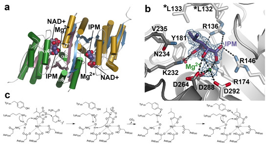 The three-dimensional structures of AtIPMDH2 and extensive biochemical analysis of site-directed mutants suggest a reaction mechanism for IPMDH (Figure 5c) [87]. After formation of the E•IPM•Mg2+•NAD+ complex, Lys232 abstracts a proton from bound water to activate its function as a general base. The activated water accepts a proton from the substrate hydroxyl group with transfer of a hydride to NAD+. Next, the Mg2+ ion serves as a Lewis acid that facilitates decarboxylation of the β-keto acid. The resulting enol tautomerizes to the ketone product. Importantly, the reaction chemistry is conserved whether the substrate is IPM in leucine biosynthesis or the 3-malate derivative in the aliphatic glucosinolate elongation cycle. These substrates differ in the aliphatic chain length.