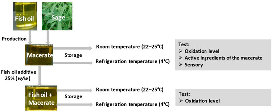 Commonly, the maceration process is usually used to flavor edible oils with aromatic plants. This method enriches the oil with not only aromatic compounds but also antioxidants [6]. The maceration process can take place in a conventional manner, which consists in naturally soaking the plants in oil, usually for 14–15 days [7,8], but sometimes longer—45 days [9]. Supporting maceration with additional treatments allows you to significantly shorten the maceration time from several weeks to several or several minutes [6,10]. The maceration process can be supported by mixing [11], homogenization [5,12] and the use of ultrasound [6,10,13], or microwave heating [14]. Various herbs and spices (fresh and dried) are most often used to flavor edible oils [7,8,9,11]. So far, the studies have produced and tested macerates with rosemary, sage, summer savory, laurel, oregano, garlic, basil, thyme, lavender, menthe, chill pepper [6,7,8,9,10,11,12,13,14,15,16,17]. Among the plants used for maceration and aromatization of oils, rosemary has proven to be one of the most suitable herbs. It increased the antioxidant capacity and increased the oxidative stability of olive oil [6,7,15]. The most commonly used and best-studied oil for maceration is olive oil [6,7,8,9,10,11,12,13,14,15,16,17]. Other oils are used less frequently in studies: sunflower [12], oils from the seeds of black cumin, borage, evening primrose, safflower, walnut, common hazel, and oilseed rape, the flesh of sea-buckthorn fruits [16]. There is little data on the aromatization of fish oils. Only in the previous work, a concentrated macerate of cod liver oil and sage was obtained, which was then added to the oil in various amounts and its stability was tested in the accelerated oxidation test with UV rays [5]. However, there is no data on the effect of sage maceration on fish oil under natural conditions, when stored at refrigerated and room temperature. The results obtained in accelerated oxidation tests do not always coincide with the results obtained in natural conditions.
