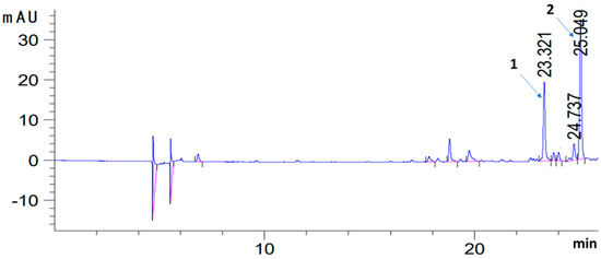 Chromatogram (HPLC) of an extract (70% methanol) from the sage macerate (1-carnosol, retention time—23.321 min; 2-carnosic acid, retention time—25.049).