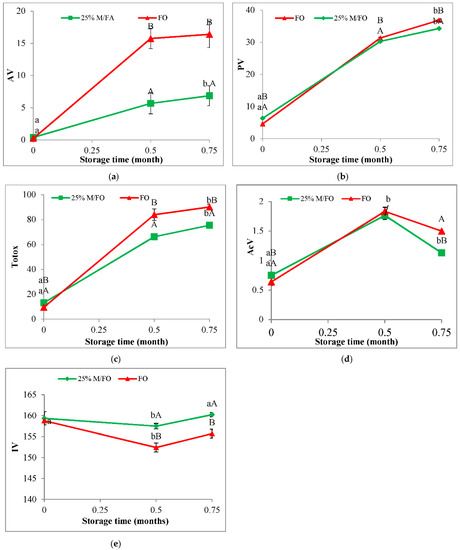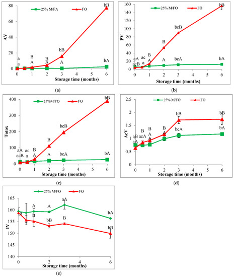 Anisidine value (a), peroxide value (b), Totox (c), acid value (d), iodine value (e) fish oil with macerate (25% M/FO, green) compared to control fish oil (FO, red) stored at refrigeration temperature (4 °C). (Values marked with the same lowercase letters a, b differ statistically significantly within the stored samples (25 M/FO or FO), while values marked with different uppercase letters—A, B differ significantly within the same storage time. Analogically values marked with the same letters do not differ statistically significantly, p < 0.05).