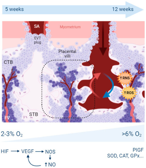 During the first weeks of pregnancy, the embryo is in a low oxygen concentration environment. The trophoblast cells form EVTs plugs in the uterine arteries, blocking maternal blood circulation into the lacunae and thus thwarting oxygenation. This hypoxic state is crucial for placenta development, expediating trophoblast invasion into the maternal decidua. Trophoblast cellular functions and transcription is regulated by the two main Hypoxia-Inducible Factors (HIF-1 and HIF-2). These two transcription factors bind to specific DNA sequences called hypoxia response elements (HREs), present in more than 200 genes. HIF-1 is a heterodimeric protein composed of an oxygen-sensitive subunit (HIF1-α) and an oxygen-independent subunit (HIF-1β) [7]. In a hypoxic environment, HIF1 is stabilized, functional, and will, in particular, stimulate the expression of the vascular endothelial growth factor (VEGF), a key player in vascularization, branching, angiogenesis, and endothelial proliferation [8]. VEGF depends on nitric oxide (NO), which is synthetized by NO synthases on STB and fetal endothelial cells (in particular, iNOS—the inducible gene and eNOS—the endothelial-specific gene). NO stimulates angiogenesis, vessel formation, vascular tree maturation, and organization. In the specific case of PE, measures along the three trimesters were performed in the placenta for SOD, GPx, and eNOS enzymes [9]. GPx was significantly higher during T3 (third trimester of pregnancy); SOD was lower during T2 (second trimester of pregnancy) and T3. GSH levels and GPx were lower in PE than in controls at T1 (first trimester of pregnancy).