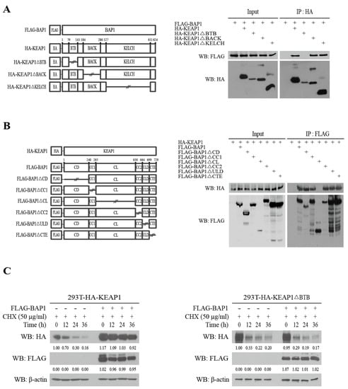 KEAP1 possesses the BTB (amino acids 79–143), the BACK (amino acids 184–286), and the KELCH domains (amino acids 317–611) (Figure 2A, left panel) [18]. In order to identify the domain of KEAP1 that interacts with BAP1, we generated pcDNA3-HA-KEAP1 mutant plasmids lacking individual domains (HA-KEAP1ΔBTB, HA-KEAP1ΔBACK, and HA-KEAP1ΔKELCH). pcDNA3-HA-KEAP1 and pcDNA3-HA-KEAP1 deletion mutants were cotransfected with pcDNA3-FLAG-BAP1 in 293T cells and cell lysates were immunoprecipitated with HA-beads followed by Western blotting analysis with FLAG-HRP antibody. Our result shows that FLAG-BAP1 does not selectively bind to HA-KEAP1ΔBTB (Figure 2A, right panel), suggesting that BAP1 binds to the BTB domain of KEAP1.
